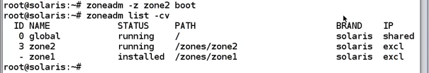 Note: You first “configure” a zone, then “install” the zone. zoneadm list -cv displays their statuses as “installed” and “running” respectively.