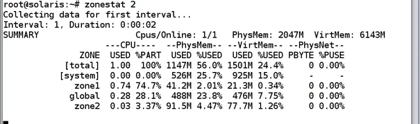 zonestat 2 (where 2 is the number of seconds between each monitoring interval/collection of resource use data)