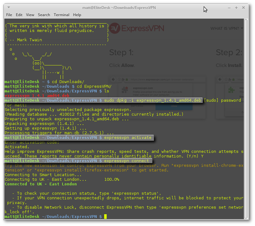 The commands to install it, activate it using the code supplied when you subscribe, and connect to it are shown below….